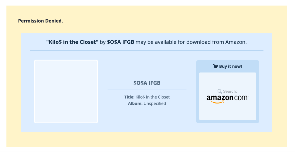 My second experience wasn’t a claim but instead a takedown. I had been hosting downloads for the music that I made in GarageBand (same songs that caused trouble on YouTube) so I could link to the files on my website. I eventually discovered when linking to one of them that they had just been removed with 0 warning and could no longer be downloaded. Below is an image of what you get if you visit the download page.