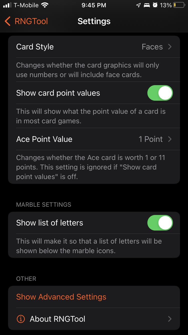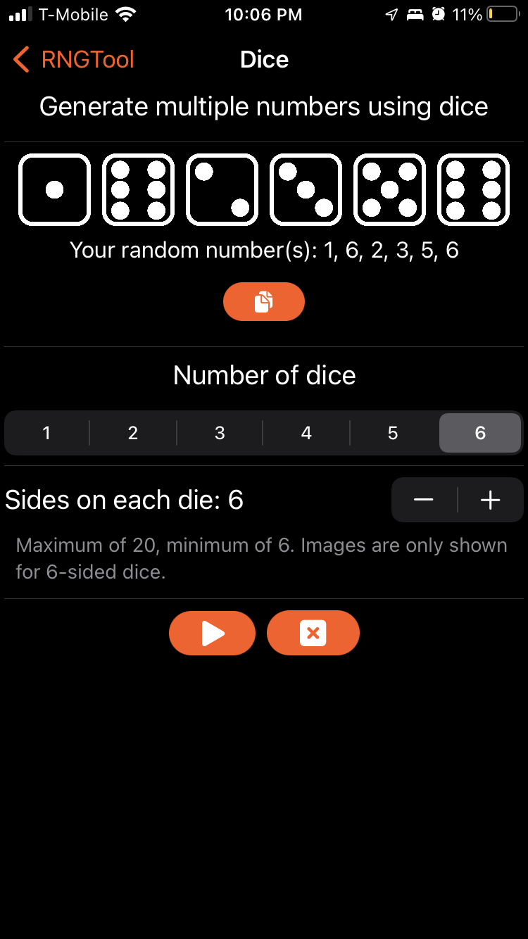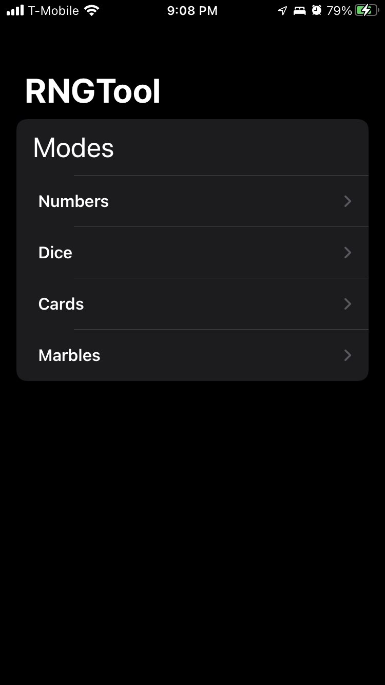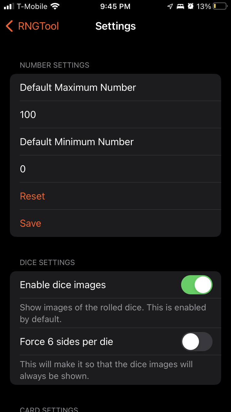 And thus began the quest to make RNGTool usable. I started with the settings, as they were a trainwreck that I unfortunately don’t have any pictures of (and it was never committed to GitHub so it’s long gone). These actually came out pretty well in the end. I managed to keep using the exact same code in both the macOS and iOS versions, just with different wrappings around the actual settings in the two SettingsView.swift files. The result is something arguably nicer to use than the macOS version, though I’ll let you judge that for yourself.